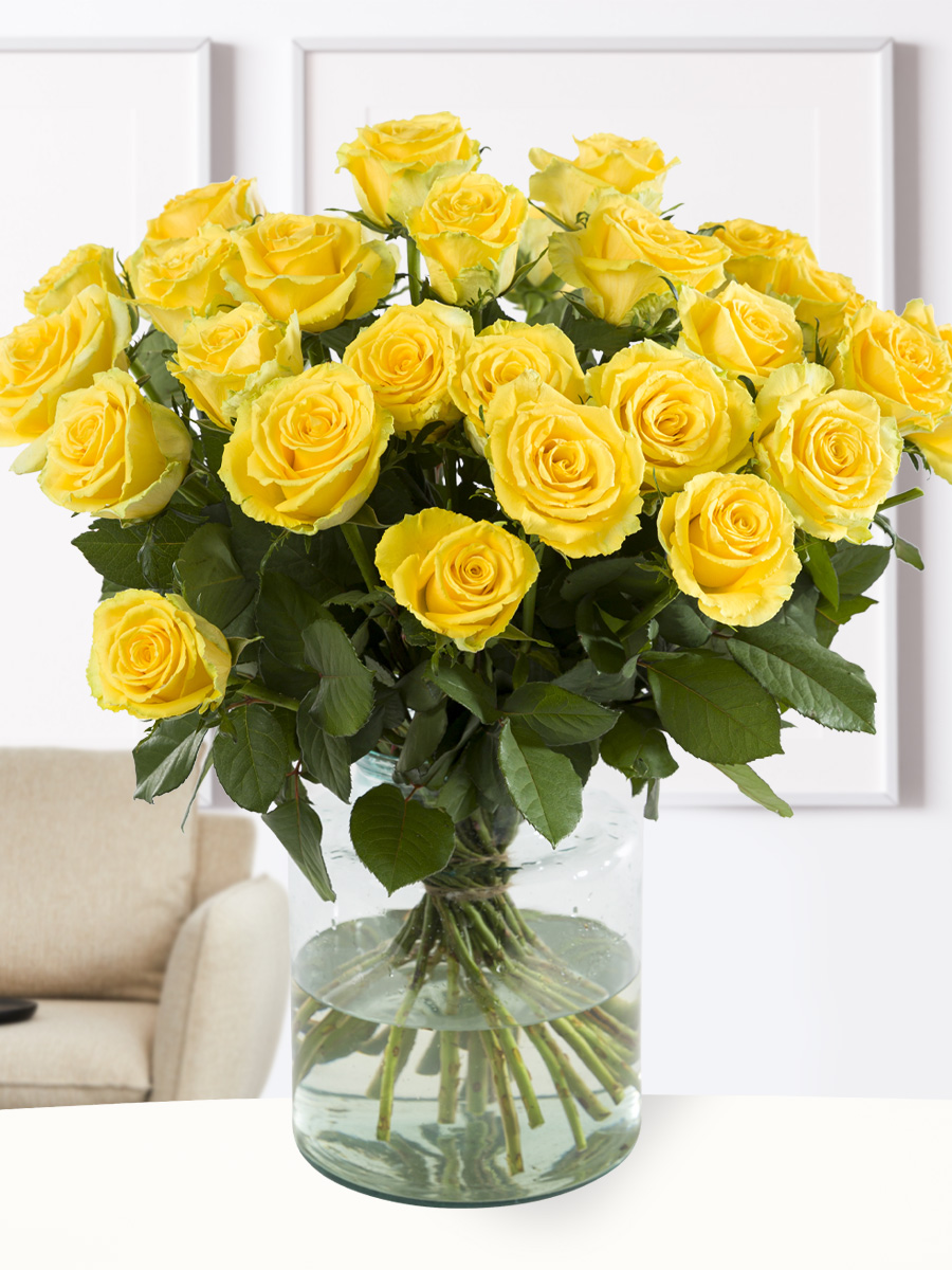 Deze Good Times rozen worden voor Surprose gekweekt door Timaflor, een kweker uit Kenia. De steellengte van dit boeket is ongeveer 50 centimeter, waardoor dit boeket op elke passende ruime vaas goed tot uiting komt. De rozen in dit boeket hebben wij ook in ons assortiment in een aantal van 10 ()of 20 () stuks. Ben je benieuwd naar ons volledige assortiment van gele rozen? Kijk dan bij onze categorie van gele rozen () en laat jezelf verrassen door ons ruime aanbod van de mooiste gele rozen. Onze rozenboeketten worden geleverd in een luxe geschenkverpakking waarbij rozenvoeding is mee verpakt om van een nog langer vaasleven te kunnen genieten. Ook geven wij jou de optie om een persoonlijke wenstekst toe te voegen aan de bestelling. Dit tekst vak kan gebruikt worden om aan te geven van wie en waarom dit boeket als geschenk gegeven wordt. Verras iemand door dit kleurrijke boeket van 30 gele rozen cadeau te doen en eventueel een extra cadeautje () toe te voegen aan de geschenkverpakking. Geef altijd een prachtig cadeau met Surprose.