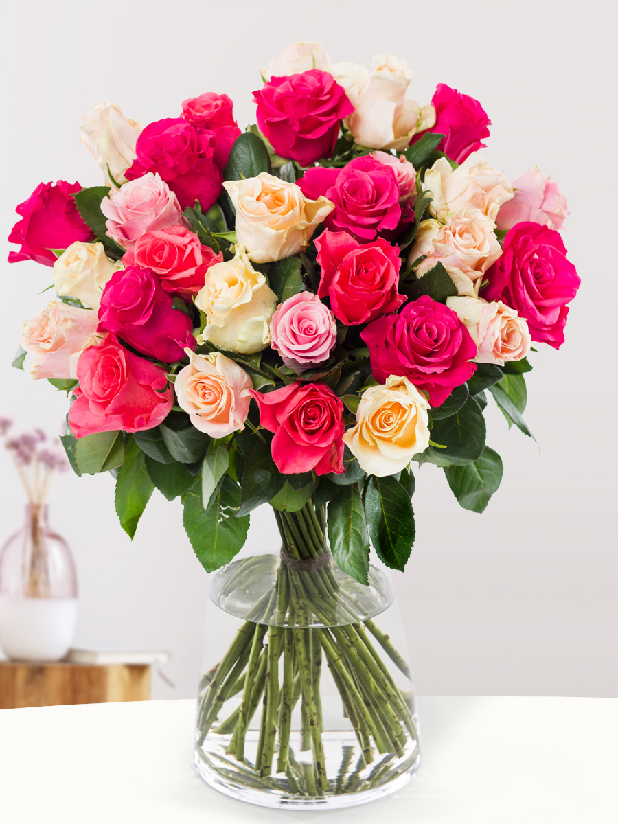 Dit hand gebonden boeket bestaat uit 30 rozen van de soort Tacazzi, met een steellengte van ongeveer 50 centimeter. De Tacazzi rozen komen van de kweker Ol Njorowa en zijn afkomstig uit Kenia. De rozen in dit boeket bestaan uit de kleuren variërend van roze, rood en zalmkleur. Dit boeket is niet alleen een prachtig cadeau, maar zorgt door haar subtiele geur ook voor rust en kalmte in huis. Dit boeket hebben wij ook in ons assortiment in een andere kleurenkombinatie, bijvoorbeeld in ons driekleurig Tacazzi boeket (), of met enkel roze rozen gebonden met gipskruid (). Is dit prachtige boeket een cadeau? Schrijf dan jouw persoonlijke wenstekst in het daarvoor bestemde vak en deze zal op een gratis kaartje bij de bestelling geleverd worden. Geniet zelf of verras iemand anders met dit mooie rustgevende boeket Tacazzi rozen van Surprose!