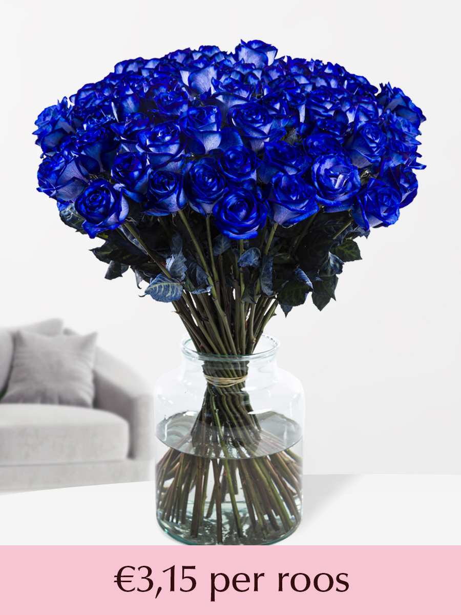 *Deze rozen hebben een blauwe kleur door blauwe inkt. Door het kleuren van de rozen kleuren de bladeren ook mee, wat volkomen normaal is. De bladeren van de roos kunnen droog lijken, ook dat komt door het kleurproces en is niet te vermijden. Dit heeft ook geen invloed op het vaasleven van de rozen in de vaas.