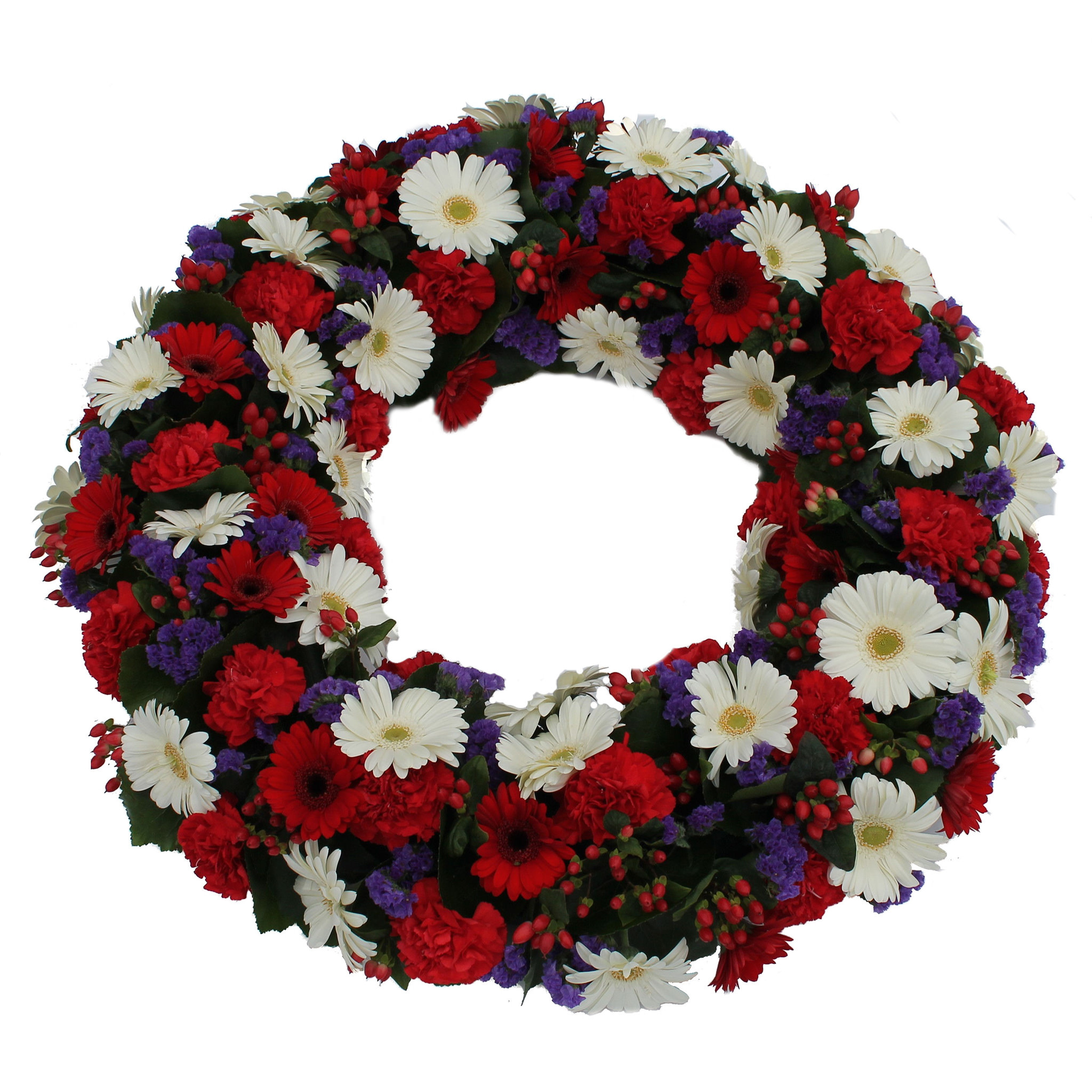 Deze Ajourkrans is opgemaakt met Rode en Witte Gerbera’s en een Blauwbloem van het seizoen. De rouwkrans is beschikbaar in Groot (50 cm, zie afbeelding) en XL (60 cm). Een rouwlint of -kaart kunt u in de volgende stap toevoegen.
