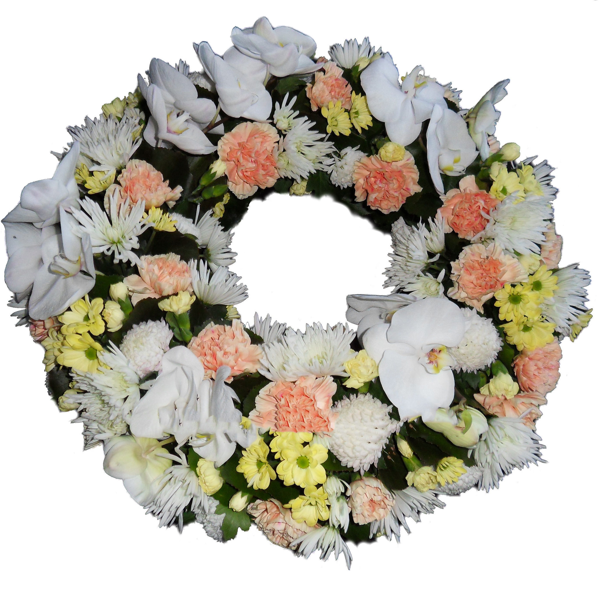 Deze Ajourkrans is opgemaakt met Orchidee bloemen en diverse Witte en Pastel bloemen naar de keuze van de bloemist. De rouwkrans is beschikbaar in Groot (50 cm, zie afbeelding) en XL (60 cm). Een rouwlint of -kaart kunt u in de volgende stap toevoegen.