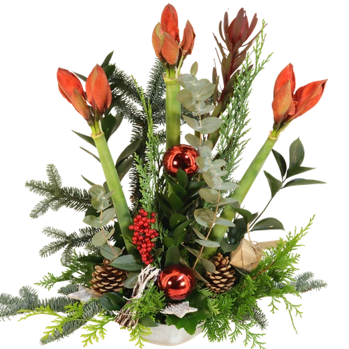 Kerststuk met 3 rode Amaryllissen. circa 60 cm hoog. Deze bloemen zijn helemaal van deze tijd die moet je in huis hebben met de kerst. Bestel nu. Thuiswinkel Lid.
