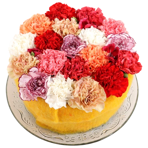 Een bloementaart met alleen anjers er in verwerkt in diverse kleuren. Een prachtig geheel van één soort bloemen in diverse kleuren.