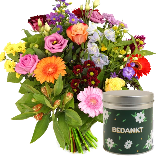Bedankt bloemen + snoep blikje bedankt bij BoeketCadeau.nl
