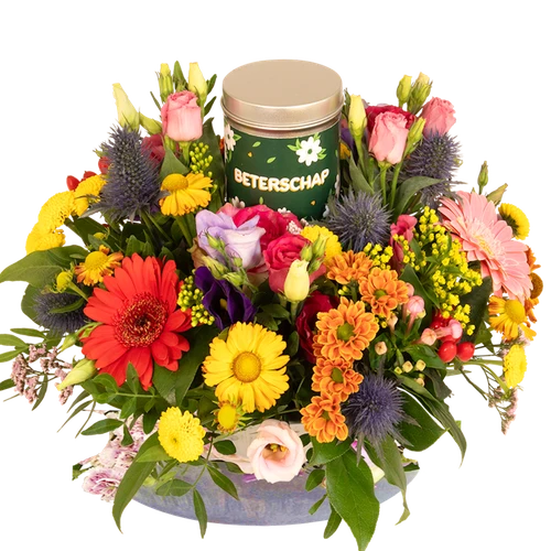 Een rond bloemstuk een biedermeier opgemaakt met een blikje beterschap snoep er in! Geef bloemen voor een zieke of ander moment. Thuiswinkel lid. Makkelijk bestellen.