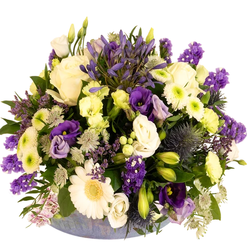 Biedermeier in de blauw paars witte tinten bestellen gaat eenvoudig en snel bezorgd in heel Nederland.