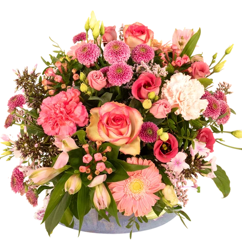 Bloemstuk met diverse roze bloemen opgestoken in steekschuim ook wel biedermeier genoemd.