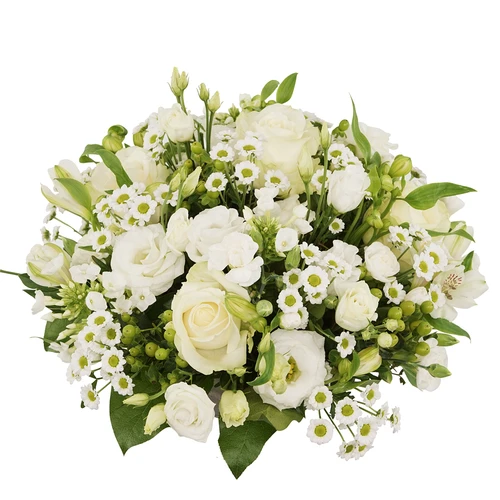 Bloemstuk in het wit rond opgestoken. Biedermeier witte tinten laten bezorgen in heel Nederland. Versgarantie