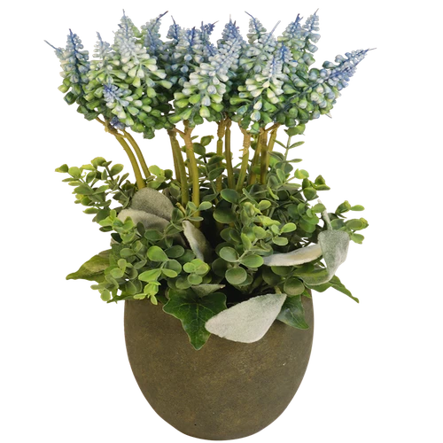 Kunstbloemen blauwe druifjes opgemaakt in een pot. Kant en klaar om neer te zetten. U hoeft er niets aan te doen.