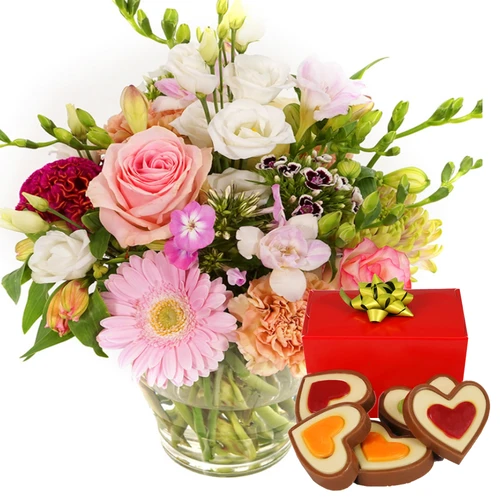 Bloemen opgemaakt in een glazen vaasje kant klaar bezorgd aan huis met de overheerlijke hartjes chocolade.