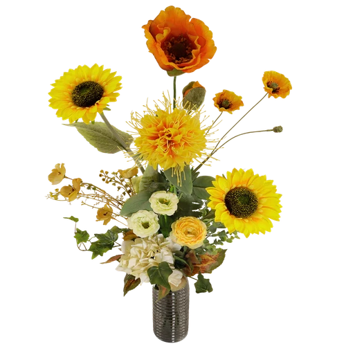 Een boeket kunstbloemen met o.a zonnebloemen er in verwerkt. Een zonnebloemen kunstboeket. Ideaal voor de zomer!