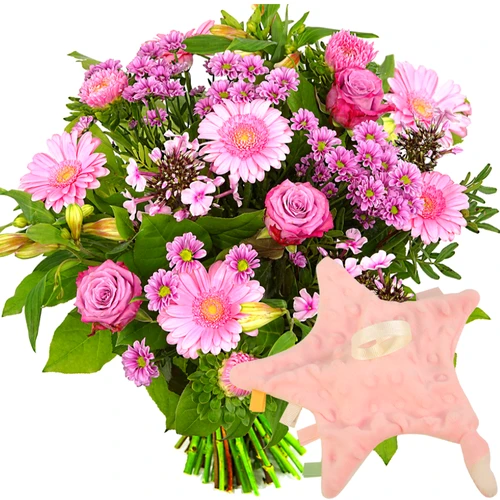 Geboorte bloemen voor een meisje, prachtige verse bloemen in de roze kleuren. Dit wordt samen bezorgd met een ster speen tutteldoekje. 6 dagen per week bezorgd. Thuiswinkel.