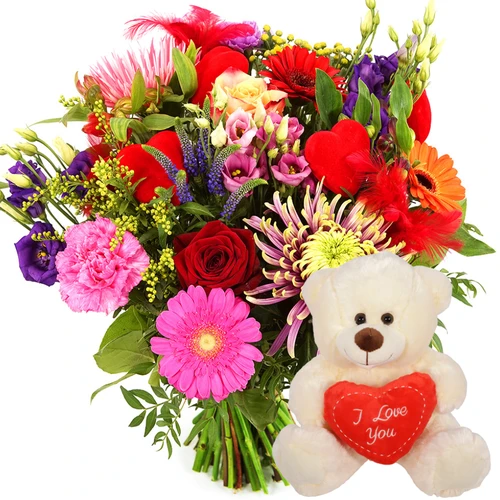 Moederdag bloemen vers ingekocht, Een bont boeket met hartjes en een i love you knuffelbeer samen bezorgt voor Moederdag. Thuiswinkel Lid.