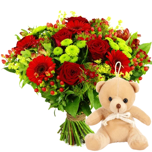 Een rood groen boeket van seizoen bloemen met iets extra’s! Een lief licht bruin knuffeltje. Ophangen kan!. Bestel makkelijk online bij BoeketCadeau.nl