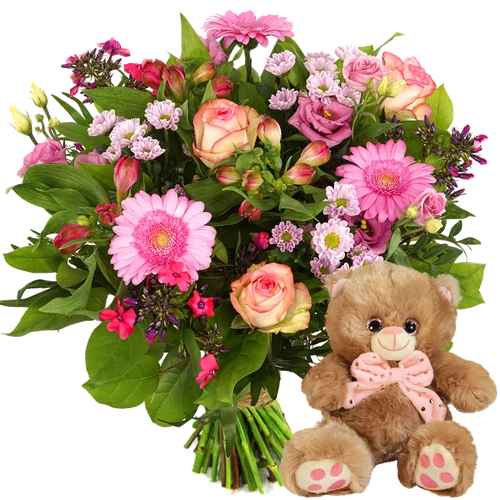 Een geboorte boeket voor een meisje en geboorte knuffeltje samen bezorgt in een luxe geschenkdoos van BoeketCadeau.nl