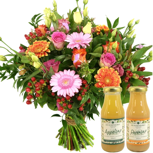 Boeket bloemen in de roze en oranje kleuren samen bezorgt met heerlijke sappen. Stuur een beterschap bloemetje met lekkere sappen. Thuiswinkel lid.
