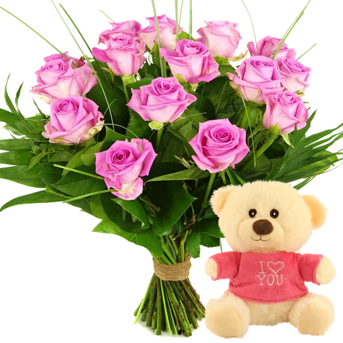 Boeket roze rozen + knuffelbeertje i love you