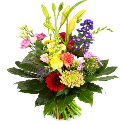 Een bonte verzameling van bloemen die op een moderne wijze korrenschoof zijn gebonden, speels en eigen tijds modern boeket bloemen. Bestellen gaat eenvoudig. Geen account nodig. Thuiswinkel Lid. Veel betaal mogelijkheden ook achteraf betalen.