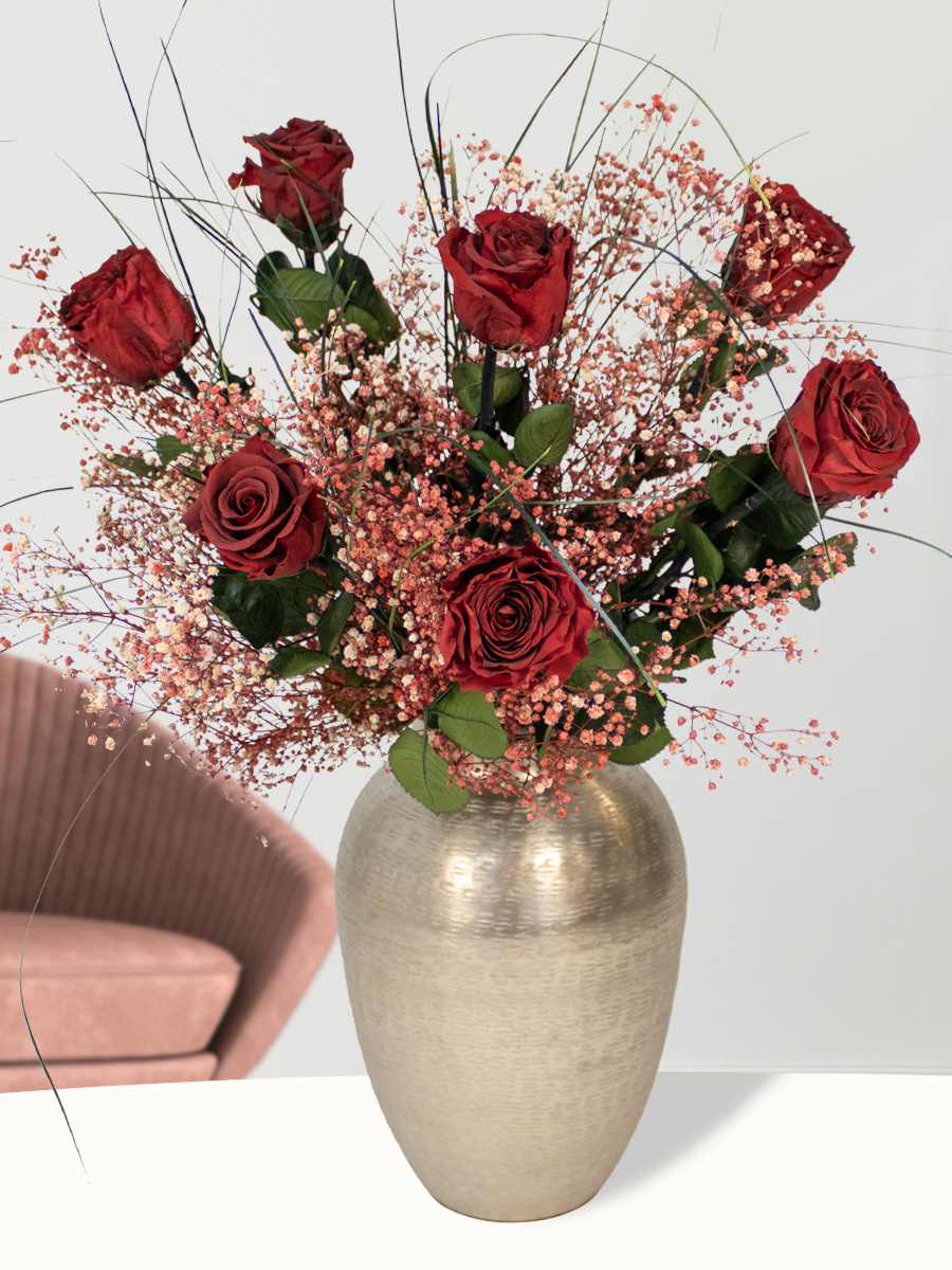 * Diameter boeket: ca. 40 cm Dit boeket is langer houdbaar dan onze verse rozenboeketten. Deze long lasting rozen zijn verse rozen, die zijn bewerkt met een biologisch afbreekbare stof waardoor de rozen veel langer blijven staan als normaal. Van de steel, de bladeren tot aan de roos. Dat is ook direct waarom de rozen geen water nodig hebben. Wij raden daarom aan om de rozen droog, in een ondoorzichtige vaas te zetten. Wat nog kan helpen bij het op de vaas zetten van de rozen is een laagje zand in de vaas te doen, zodat de rozen blijven staan, zoals jij dat wilt hebben!