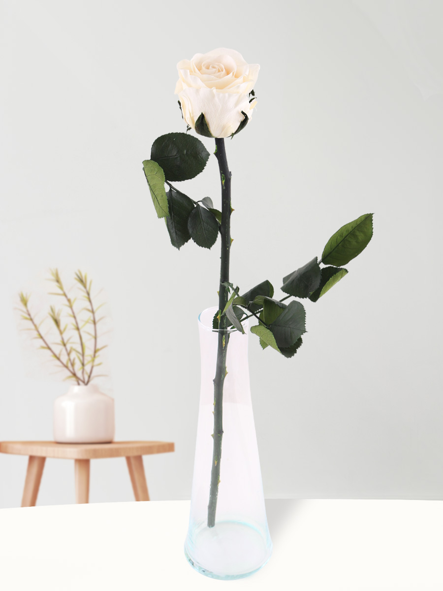 Enkele crèmekleurige geprepareerde roos met vaasje
