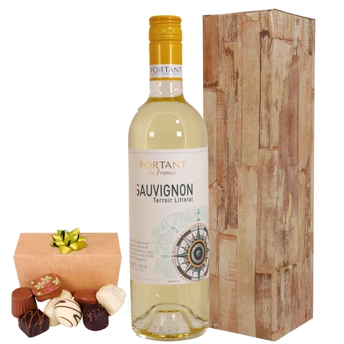 Een fantastisch wijngeschenk: Een fles Franse Fortant witte wijn en heerlijke bonbons. Bestel je bij BoeketCadeau.nl