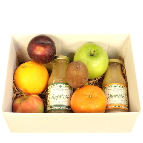Vers fruit in een kartonnen box en heerlijke Olmenhorst sapjes bij het verse fruit. Bestellen gaat eenvoudig. Thuiswinkel lid.