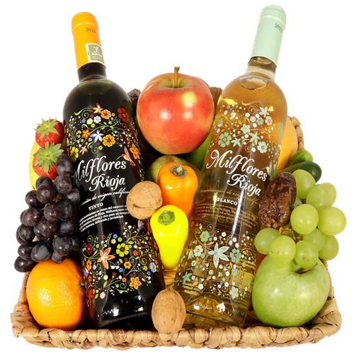 Fruitmand met heerlijk rode en witte wijn opgemaakt met vers fruit in een stevige vierkante fruitmand. Bestel vandaag nog!