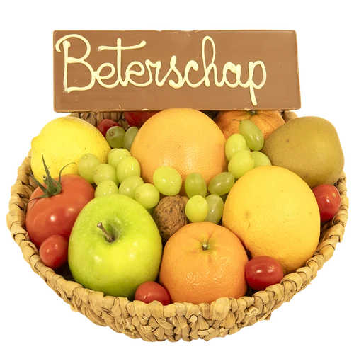 Lekker vers fruit opgemaakt in een mooie schaal met een heerlijke chocoladereep met de tekst Beterschap er op.