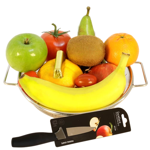 Een fruitmand geleverd in duurzaam materiaal en een fruitmes om het heerlijke verse fruit direct te kunnen consumeren.