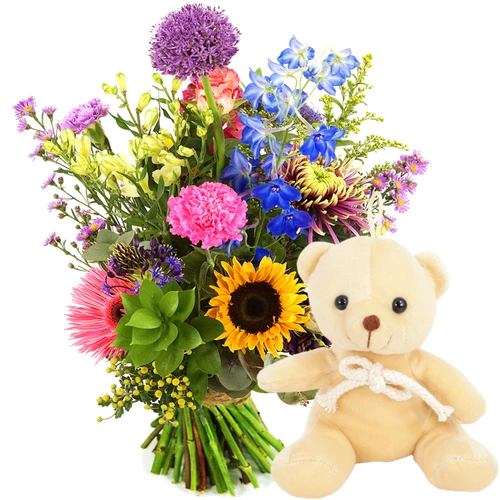 Een vrolijk geplukt bonte verzameling van bloemen met een extra licht bruin knuffeltje van 16 cm. Bestel makkelijk online bij BoeketCadeau.nl