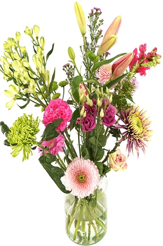 Pluk bloemen in het roze samen met glazen melkbus vaas bezorgd in heel Nederland. Thuiswinkel lid. Versgarantie.