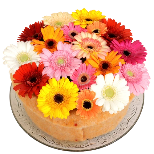 Een taart van verse bloemen, Een bloementaart met alleen diverse kleuren gerberas. Thuiswinkel lid. Bestel eenvoudig.