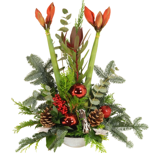 Rode Amaryllissen, 2 stuks opgemaakt in een vers kerststuk, klassiek maar tijdloos zijn deze Amaryllissen verwerkt in een kerststuk. Bestel op tijd. Thuiswinkel lid.