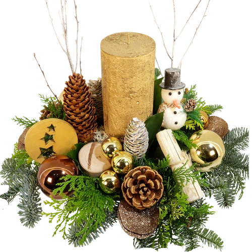 Dit kerststuk heeft een prachtige dikke gouden cilinder kaars opgemaakt met prachtige kerst materialen. Lang houdbaar is dit verse kerststuk. Bestel vandaag nog.