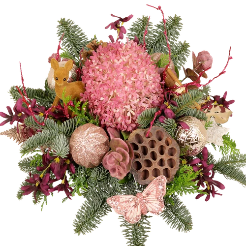 Een kerststuk in mooie roze en paarse tinten en in combinatie met goud tinten. Bestel eenvoudig. Thuiswinkel Lid.