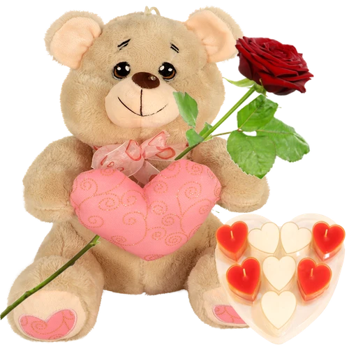 Een pluche knuffelbeer, kort harig met een roze hart in zijn handen samen bezorgd met een doosje hartjes waxinelichtjes.
