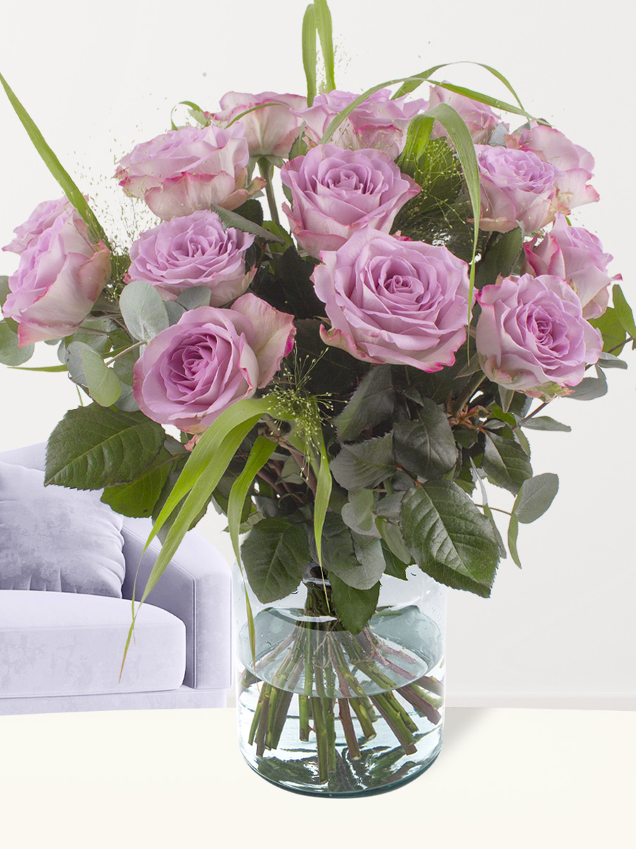 Deze lila roos is van de soort Memory Lane en wordt in dit boeket met de hand gebonden samen met panicum en eucalyptus om het boeket tot een volledig geheel te maken. Deze rozensoort wordt door Altima en Timaflor in Kenia gekweekt. Een lavendel kleurige roos is niet iets wat je elke dag ziet en heeft een bijzondere kleur, waardoor deze roos als prachtig geschenk gezien wordt. Deze Memory Lane heeft vrijwel geen doornen! Dit boeket met enkel paarse rozen heeft een lengte van ongeveer 50 centimeter en komt het beste tot uiting op een middelgrote ruime vaas, waardoor de rozenknoppen alle ruimte hebben om volledig open te bloeien. Geef bij dit paarse boeket bijvoorbeeld een van onze wijnen, champagnes, of chocolades cadeau om het geschenk af te maken. Geef bijvoorbeeld een wijn cadeau bij een verjaardag, een champagne bij een jubileum of een chocolade bij een bedankje. Het ruime assortiment van Surprose biedt jou de kans om een perfect cadeau samen te stellen. Verras nu door deze paarse rozen te bestellen en te versturen met Surprose of geniet zelf van dit uitzonderlijke boeket in je eigen woonkamer!