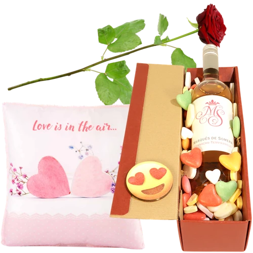 Liefde in de lucht….. Valentijnsdag cadeau een LOve in the air lig kussen, wijn met hartjes snoep, en verse rode roos samen bezorgd op Valentijnsdag.