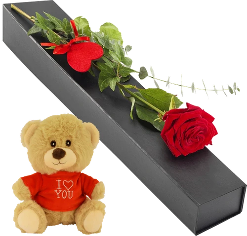 Een mooie verse valentijn rode roos in een luxe zwarte geschenkdoos en een knuffelbeertje met een rood shirt met de tekst I love you er op. Samen bezorgd in heel Nederland