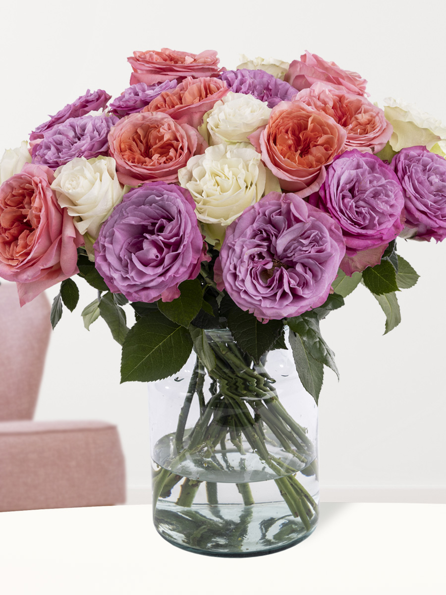 Een perfect boeket voor gelegenheden als: een verjaardag, een jubileum of zelf een huwelijk! De rozen zijn van zeer hoge kwaliteit en onderscheiden zich in de rozenbladeren. De rozenbladeren van deze rozen zijn veel bloemvormiger dan bij andere rozen. Deze rozen lijken een beetje op de Engelse David Austin rozen of zelfs wel een beetje aan pioenrozen. Verras iemand anders met een prachtig boeket van 30 rozen, wij doen er dan rozenvoeding bij en voegen jouw wenstekst of videoboodschap toe!