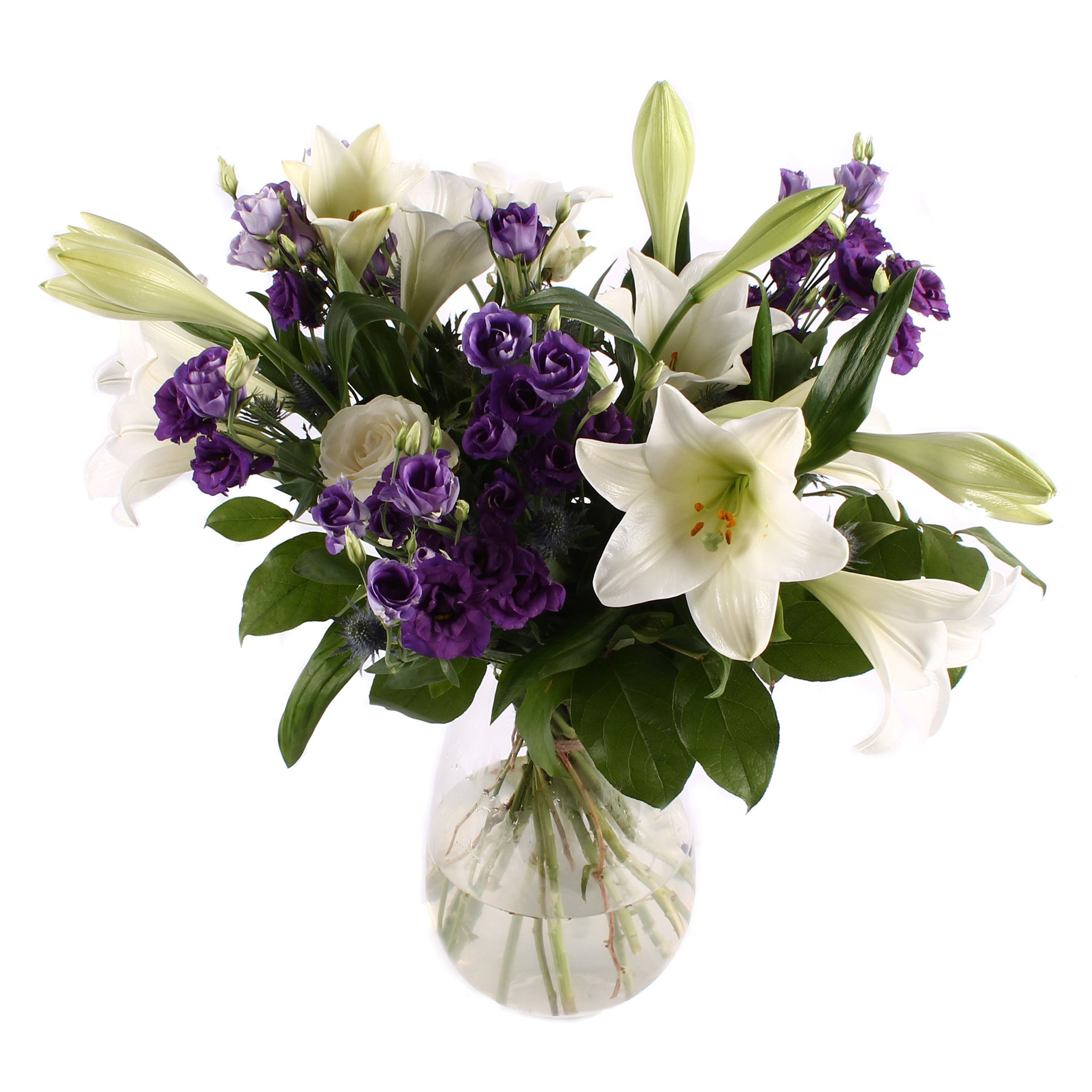 Nabestaanden boeket samengesteld met witte Lelies en paarse Lisianthus. Dit boeket heeft een steellengte van ca 40 cm. Een rouwlint, -kaart of vaas kunt u in de volgende stap toevoegen.
