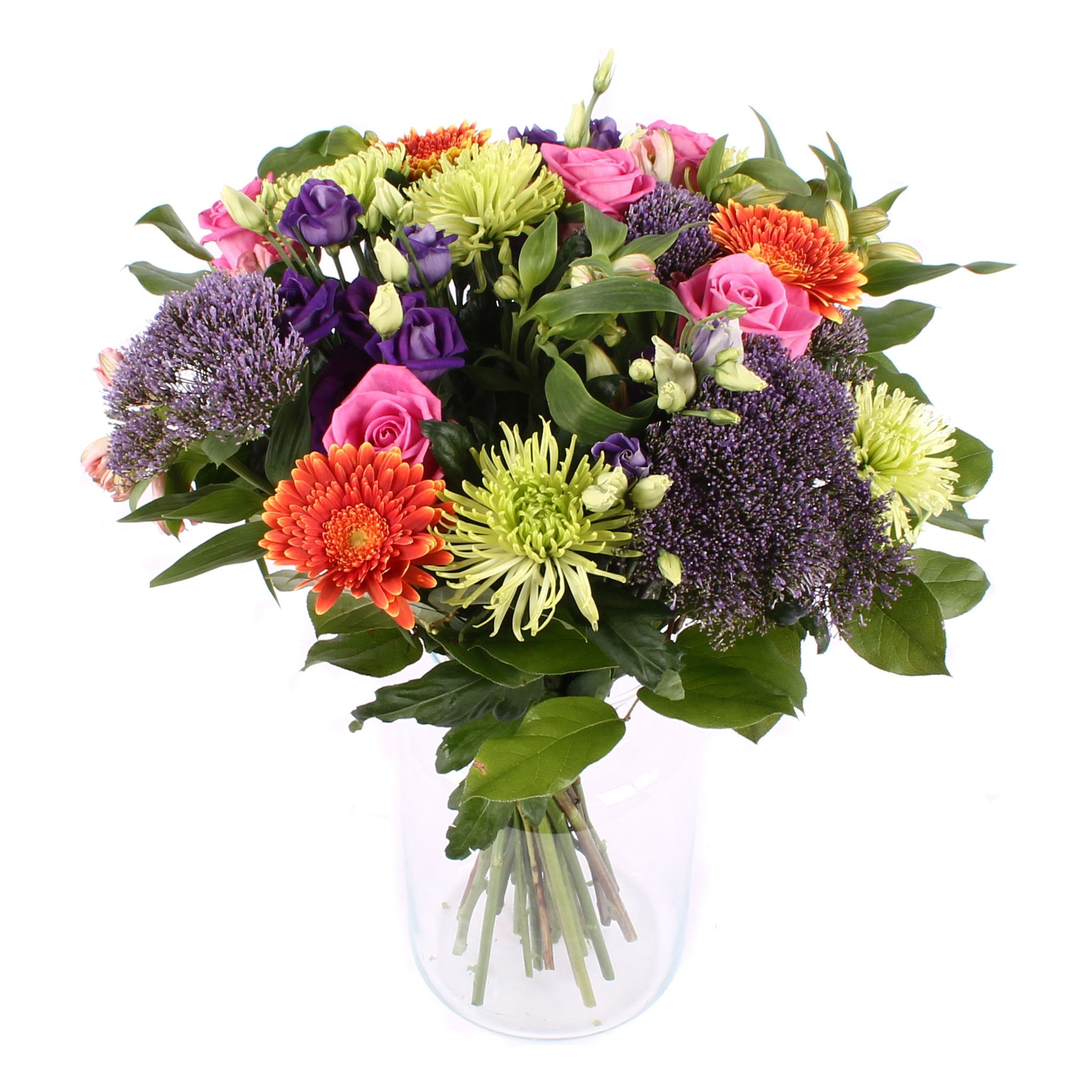 Nabestaanden boeket samengesteld door de lokale bloemist met gemengde bloemen waarvan de hoofdkleur paars is. Dit boeket heeft een steellengte van ca 35 cm. Een rouwlint, -kaart of vaas kunt u in de volgende stap toevoegen.