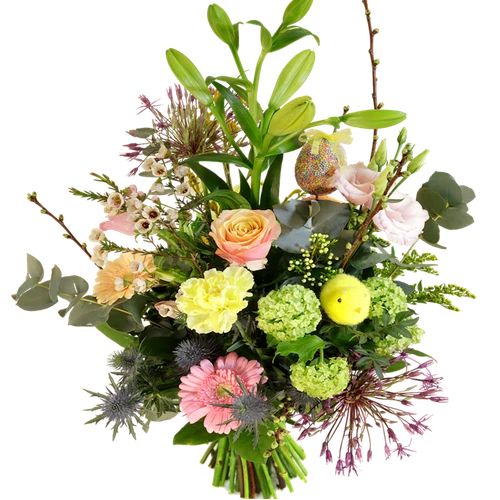 Een paasboeket hoog laag gerangschikt een verrassing om te mogen ontvangen. Bestel op tijd. Versgarantie. Thuiwinkel Lid.