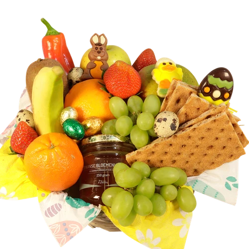Verse fruit voor de Paasdagen. Een pasen fruitmand opgemaakt als een echte paas fruitmand. Lekker en gezond fruit. Bestel vandaag nog deze fruitmand voor de pasen.