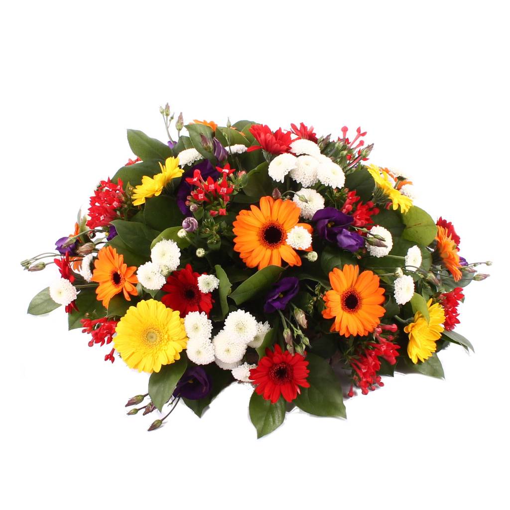 Rouwbiedermeier met gemengde Germini’s en diverse kleurrijke bloemen opgestoken met Salalblad. Een rouwlint of -kaart kunt u in de volgende stap toevoegen.