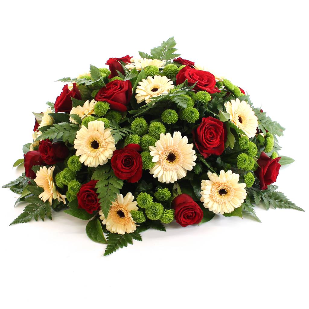 Rouwbiedermeier met rode Rozen, zalm Germini en een groene Santini, opgemaakt met Salal- en Ledervarenblad. Dit rouwstuk is beschikbaar in een ‘Groot’ variant en heeft een diameter van ca 45 cm. Een rouwlint of -kaart kunt u in de volgende stap toevoegen.
