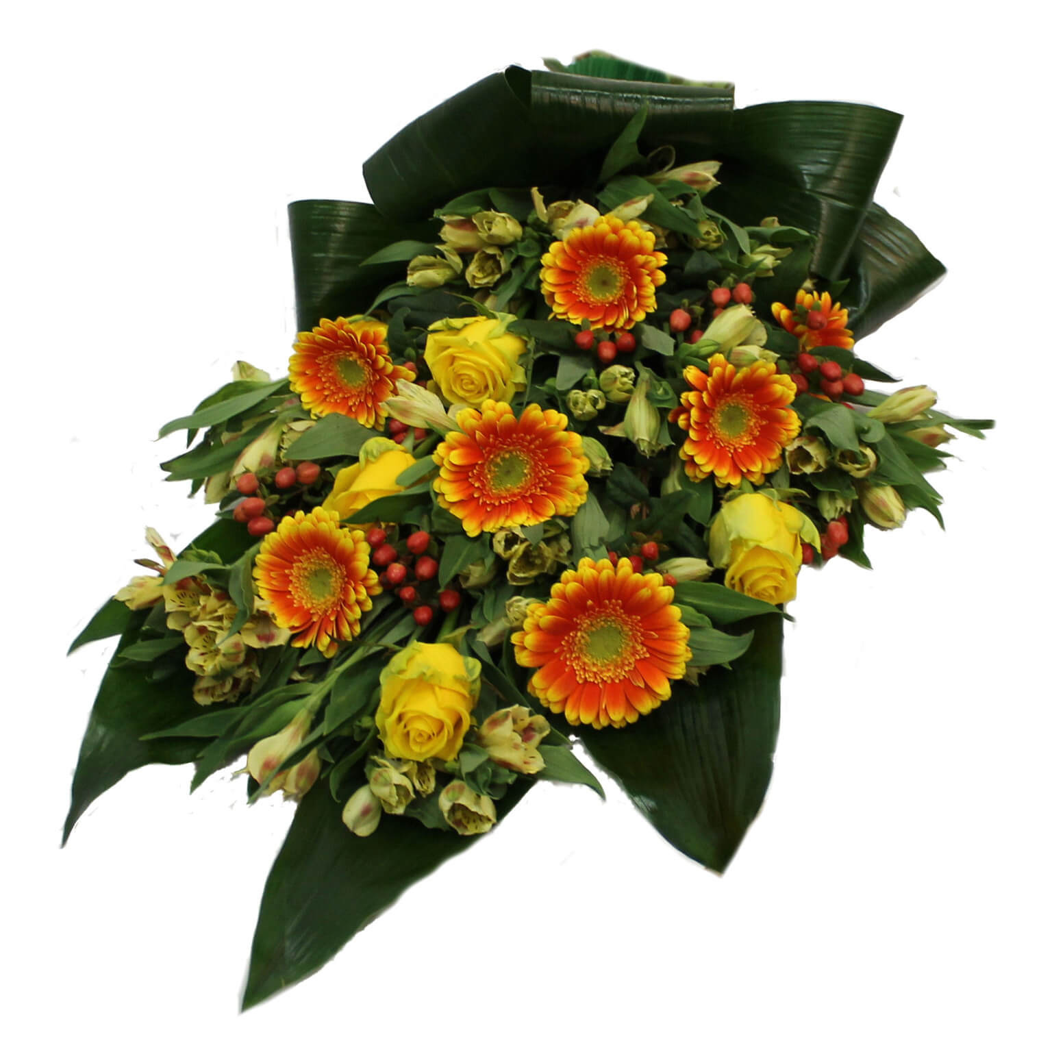 Rouwboeket geel oranje germini’s met gele rozen en gele alstroemeria aangevuld met hypericum en bladgroen. Een rouwlint of -kaart kunt u in de volgende stap toevoegen.