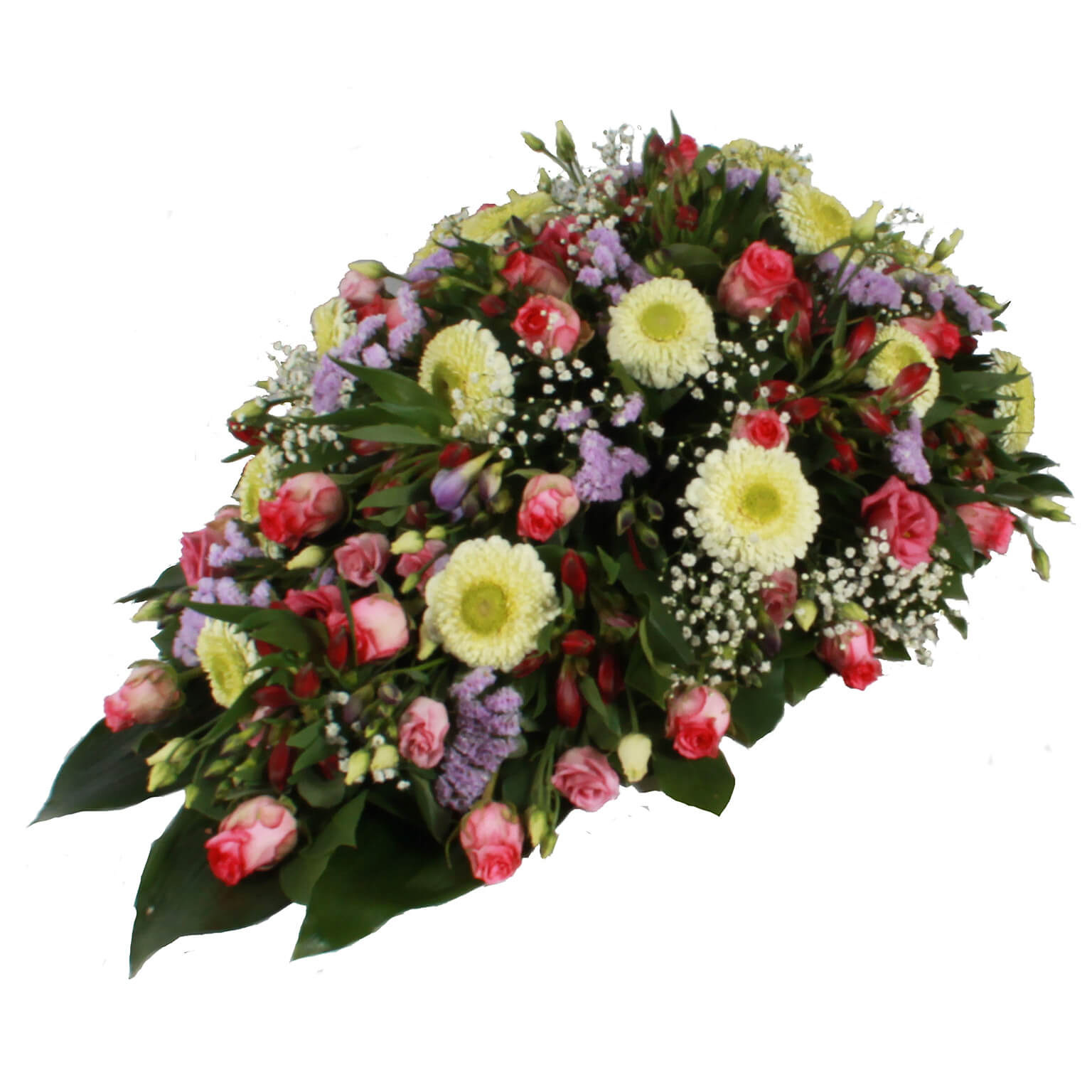 Rouwbloemstuk in een druppelvorm opgemaakt met pastel roze Rozen, zacht gele Germini, paarse Limonium bloemen naar keuze van de bloemist. Een rouwlint of -kaart kunt u in de volgende stap toevoegen.