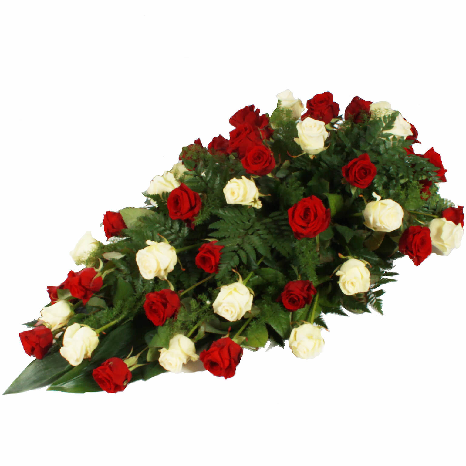Rouwbloemstuk rode en witte Rozen afgewerkt met divers groen opgestoken in een Graftakhouder. De XL variant heeft een lengte van ca 70 cm. Een rouwlint of -kaart kunt u in de volgende stap toevoegen.