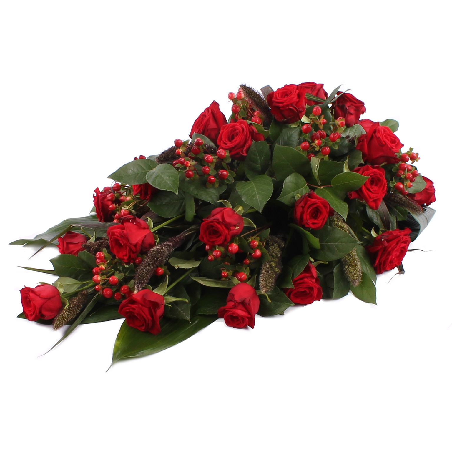 Rouwdruppel rode Rozen met rode Hypericum. Dit rouwstuk is beschikbaar in een ‘Groot’ variant en heeft een lengte van ca 55 cm. Een rouwlint of -kaart kunt u in de volgende stap toevoegen.